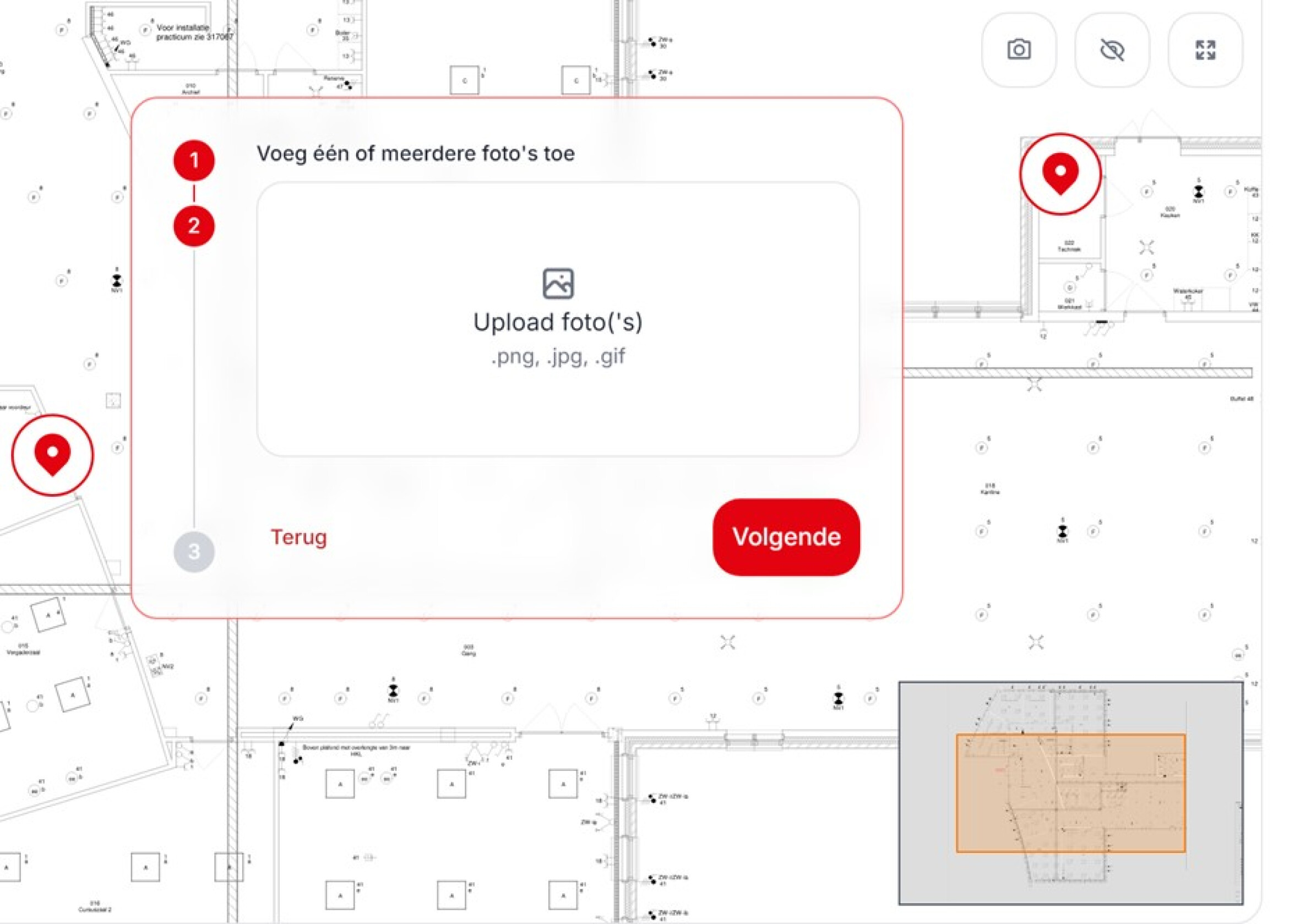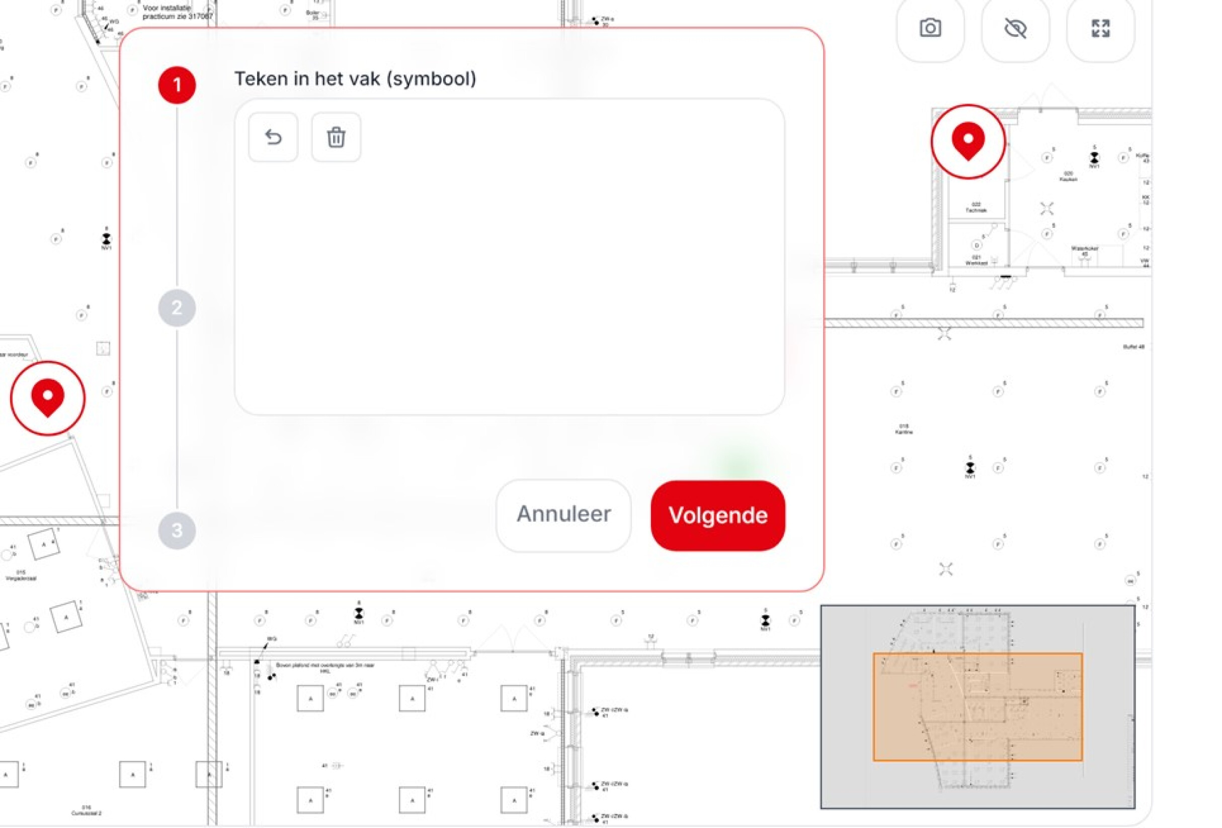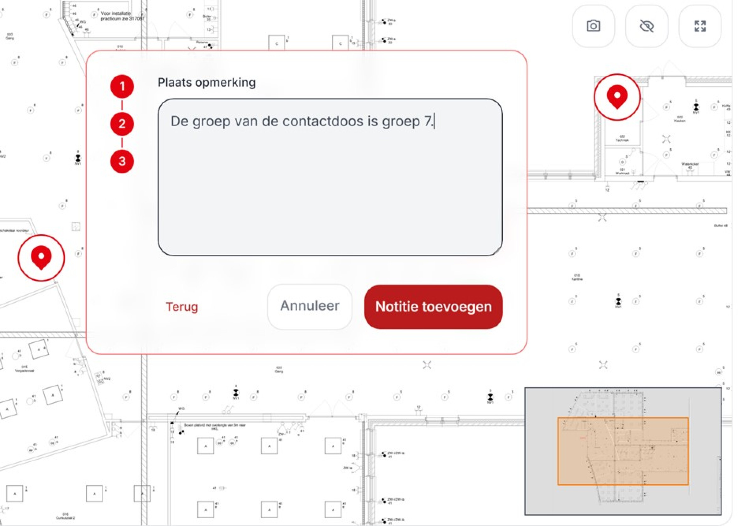 Klik op de plek waar de wijziging in de installatie is aangebracht of waar je een opmerking op wilt maken. Er opent een pop-up scherm.